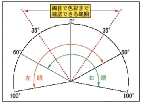 人間の視界の図です。 免許証を持ってる人は、この授業を受けてますよね。弓が後ろに流れる人は、弾いている時左眼で、自分が着ている服が何色かわかる所に常に右手があるようにすると、まっすぐになります。色や形、デザインまではっきり確認できる範囲は、…